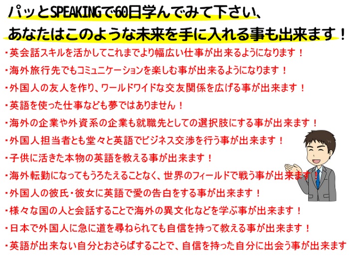パッとSPEAKINGで練習し出してちょうど1ヶ月経った頃、たまたま来られたフランス人のお客様に英語で話しかけられました。いつもの私だったら、「Sorry I cant speak english」などと答えていたのですが、この日はそのお客様からの言葉に自然に反応して答えていました。